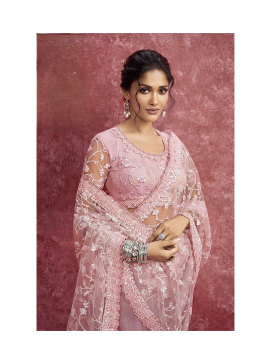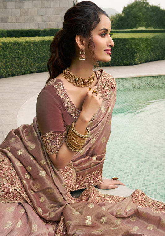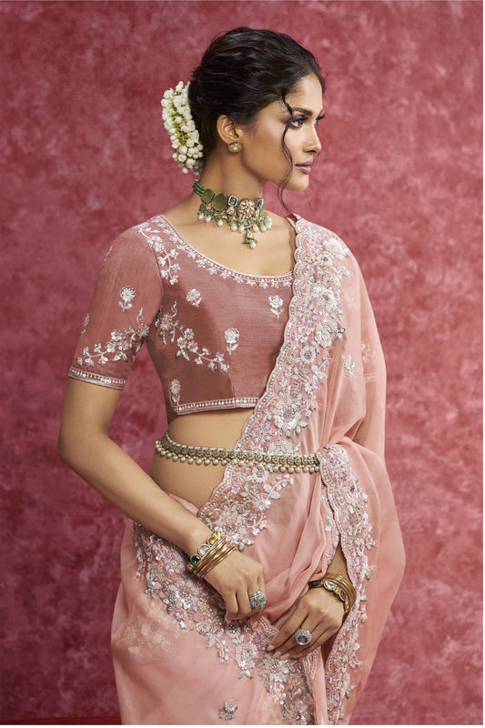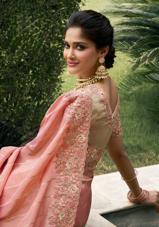 SAVE 10%Peach Pink Zari Satin Silk Saree