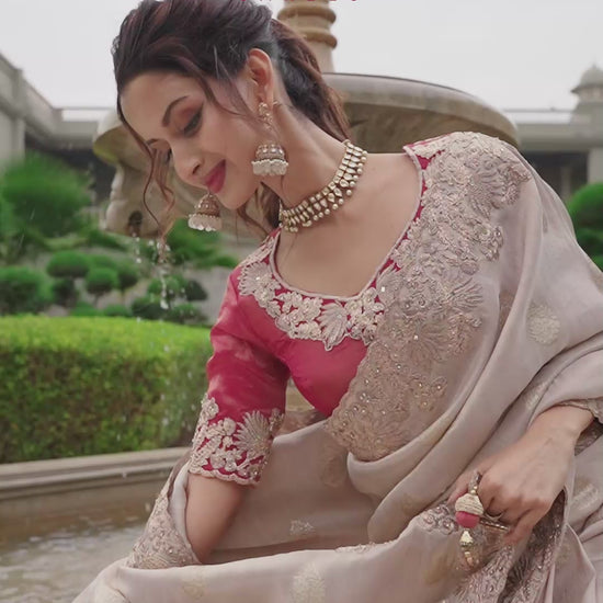 The saree is enhanced with Jacquard Butti, Resham & Zari embroidery, further detailed with sequins, beads, stones, tassels, and an embroidered blouse, giving it a luxurious and timeless appeal.