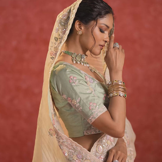 This saree perfectly blends fresh pastel elegance with a luxurious festive touch, making it a stunning choice for weddings, receptions, and traditional gatherings.