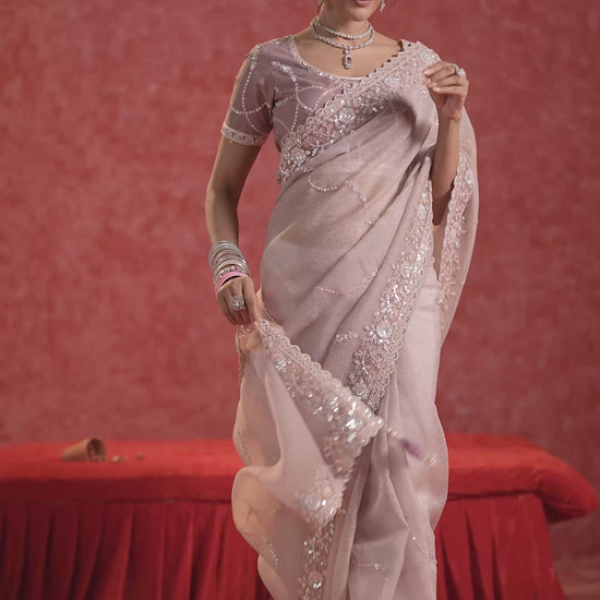 This saree blends traditional Banarasi artistry with modern embellishments, creating a look that is both timeless and regal.