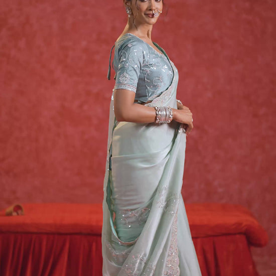 Perfect for weddings, parties, and festive occasions, this saree reflects timeless grace with a modern sparkle.