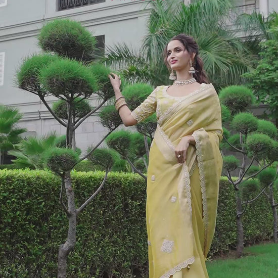 Bring a radiant charm to your wardrobe with this stunning Lemon Yellow Saree crafted in Pure Viscose Tissue Jacquard with Anmol Jari. Its bright and graceful hue makes it a perfect pick for festive occasions, weddings, and special celebrations.